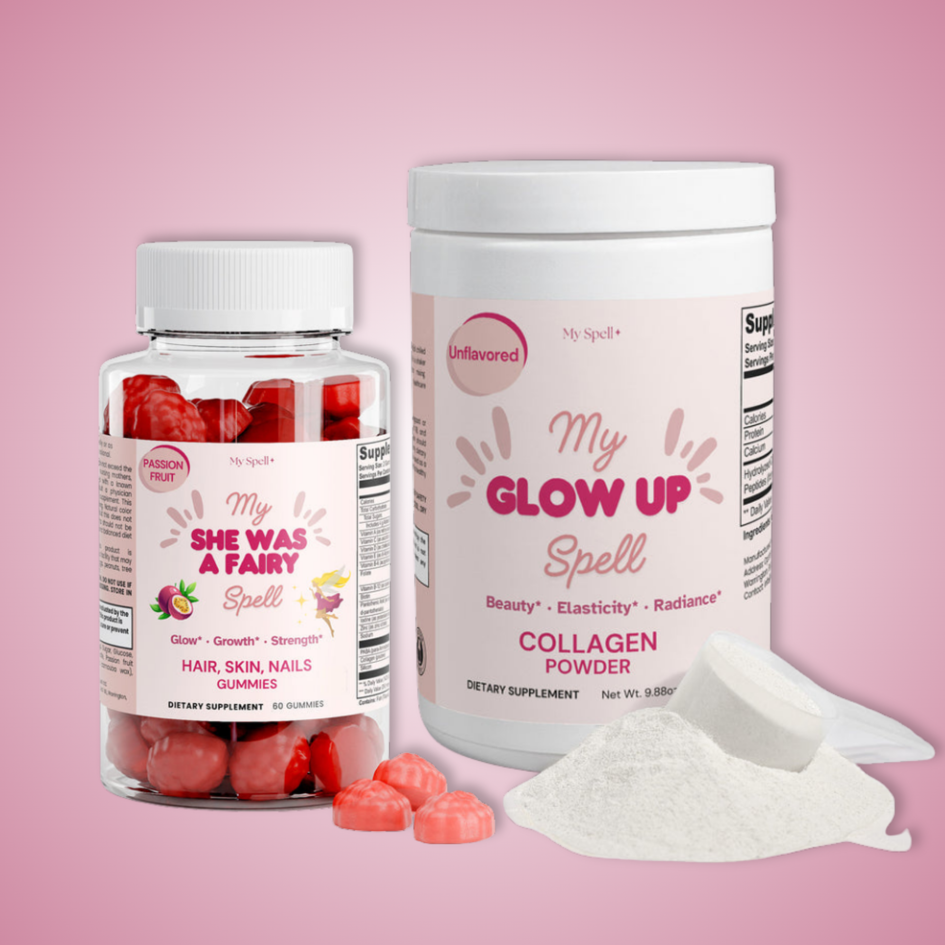 Unlock your natural radiance from within with the Beauty Spell Starter Bundle – a complete duo designed to support glowing skin, strong nails, luscious hair, and overall wellness.* This thoughtfully curated bundle combines the convenience and deliciousness of Hair, Skin & Nails Gummies with the potent, unflavored Collagen Peptides Powder, creating a versatile daily beauty ritual for women.*